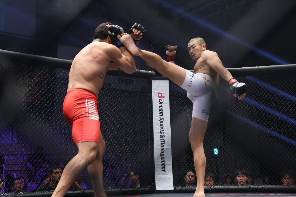 (幅540px)サウスポーの木下が距離を詰めると、バレンズエラが右に回る。木下は左ハイ。バレンズエラの右ミドルをキャッチする。ケージを背負ったバレンズエラの顔面に、スイッチして右を突き刺す。サウスポーに戻した木下は左三日月を入れたあと、ケージ際で左ミドルを当てる。組んだバレンズエラが離れてケージ際から脱した。木下は左ハイ&スイッチから右を振るう。ワンツーを打ってプッシュでバレンズエラをケージに追い込む木下。バレンズエラの右ローをすくって右フックを当てるが、ローが下腹部に入ったようでレフェリーが試合を中断。しかし木下はすぐ試合再開に応じる。